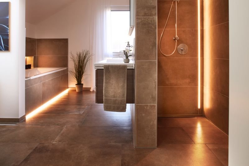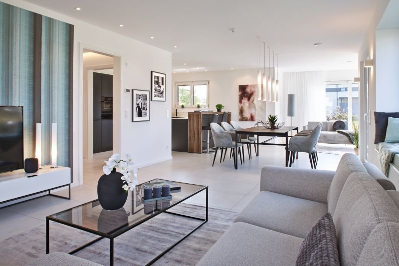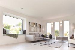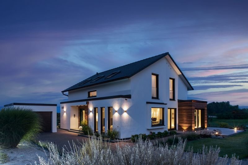 Die moderne Architektur und die offene, großzügige Bauweise erinnern an zeitloses und zugleich avantgardistisches Design dänischer Architekten und Designer. Schlicht und bestechend durch gerade Linien ist die Anmutung des Hauses, die inneren Werte überzeugen durch konsequenten Funktionalismus und smarte Technologie. Abgerundet wird das Haus durch eine freistehende Garage, die ebenfalls individuell gefertigt wird.