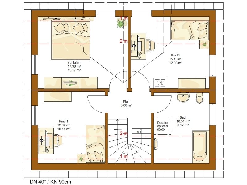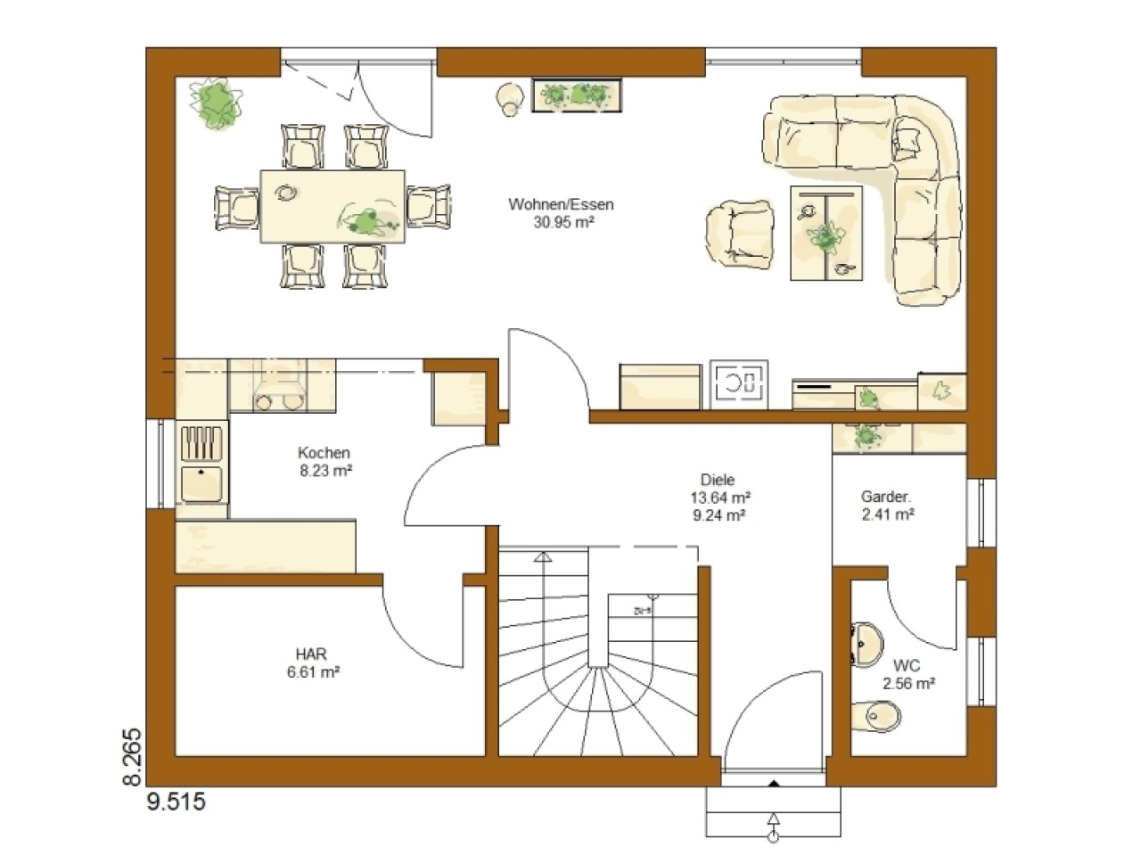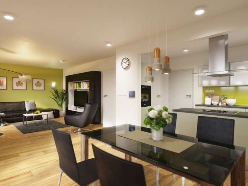 Dieses Einfamilienhaus, hier mit drittem Giebel versehen, ist das Aushängeschild zeitlos klassischer Architektur. Der dritte Giebel bringt nicht nur Platz, sondern auch zusätzliches Tageslicht in die Räume des Dachgeschosses. Ebenso reizvoll sind die offen gehaltenen und ineinanderfließenden Flächen von Kochen, Essen und Wohnen. Ein kompaktes Haus mit großer Raumwirkung, dafür steht das Wohnkonzept.